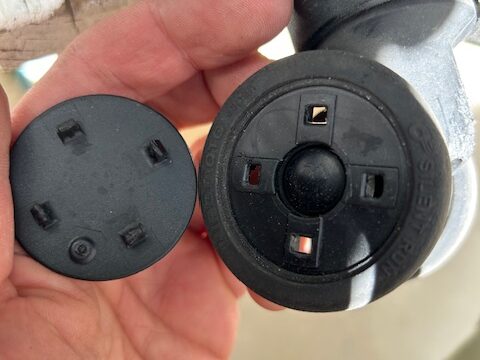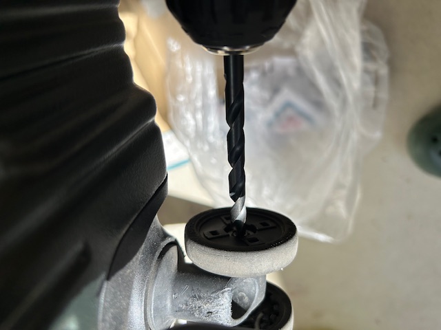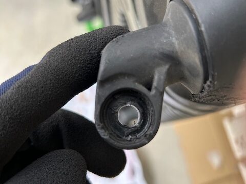 そのままでは取り付けできなかったので、スペーサーを取り付けるために穴を広げました。その後、スペーサーをセットします。こうすることで、取り付け部とタイヤにすき間ができます。