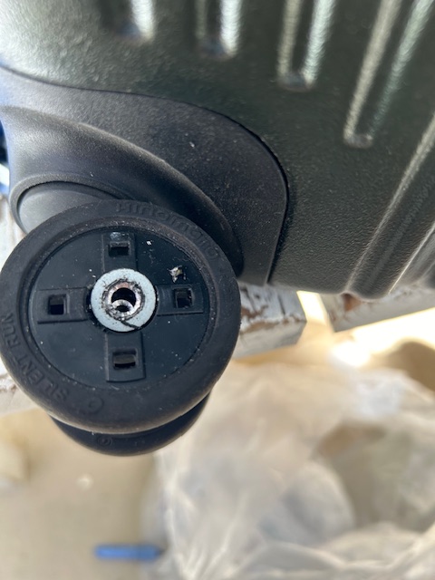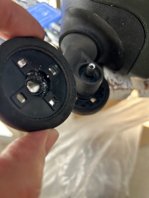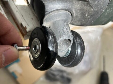 今回は、ストッパー付のキャスター交換はあきらめました。ワイヤーで引っ張ってブレーキをかけるタイプのため、交換するとブレーキが使えなくなるので断念することに。